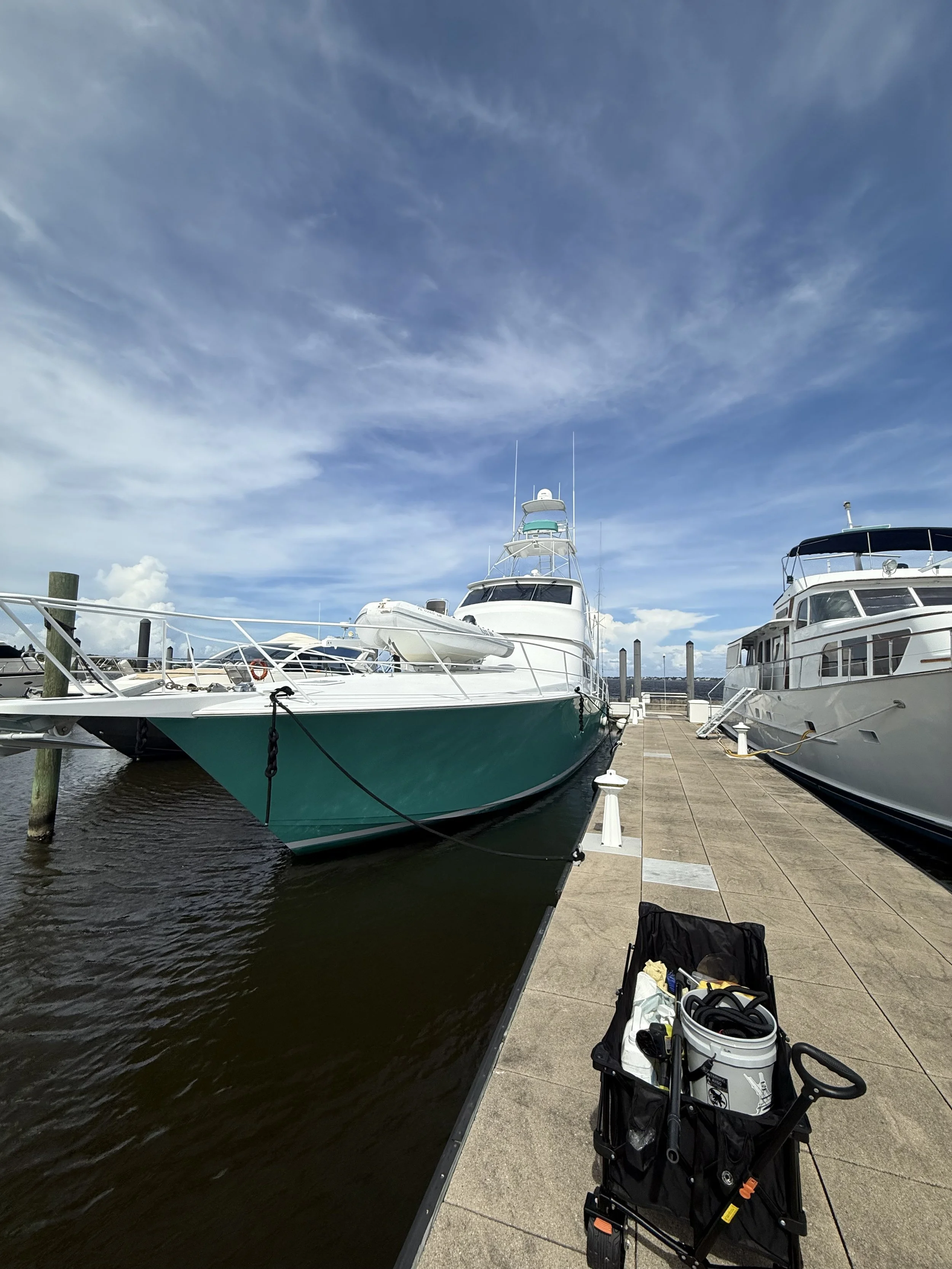 We only use tools, equipment, and chemicals that are safe on gelcoat, paint, metal, caulking, and sealants/coatings, unless otherwise specified in the scope of work (i.e. bleach out a stinky fish box, acid washing the hull, etc.)